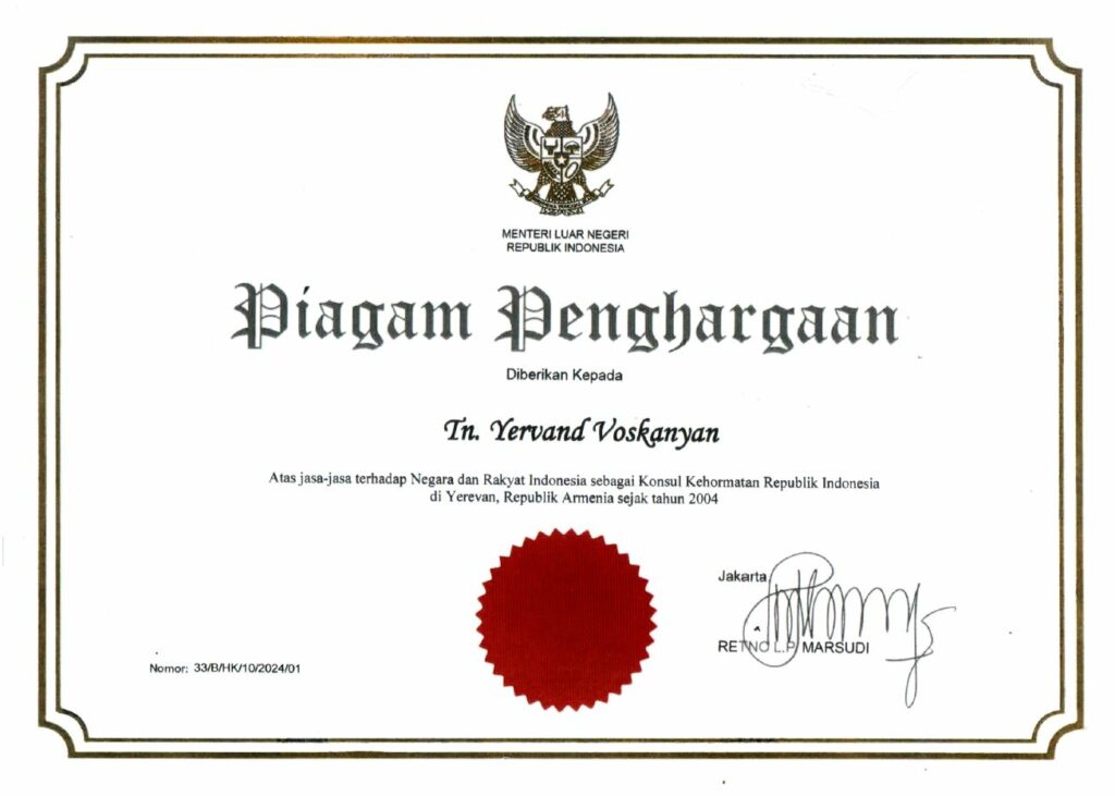 Ինդոնեզիայի Հանրապետության պատվավոր հյուպատոս պրն. Երվանդ Ոսկանյանին շնորհվել է պատվոգիր