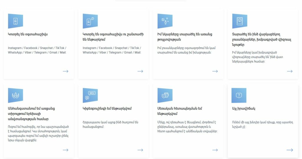 Հարգելի հայրենակիցներ։ Մենք ստեղծել ենք մի հարթակ, որտեղ դուք կարող եք գտնել լուծումներ հիմնական թվային անվտանգության հետ կապված հարցերի վերաբերյալ։ Տո էլ կոտրել են Վայբերը, էլ Տելեգրամը, Ֆեյսբուքը։ Մենք սա ստեղծել ենք երեխաների համար — բայց դուք, մեծահասակները նույնպես կարող եք օգտվել։ Հղումը տեղադրում եմ առաջին մեկնաբանությունում։ Օգտվեք, տարածեք, ինքնուրույն վերականգնվեք։